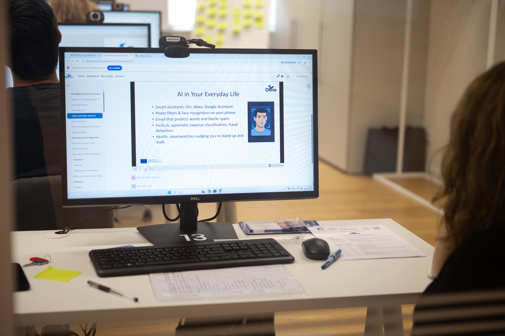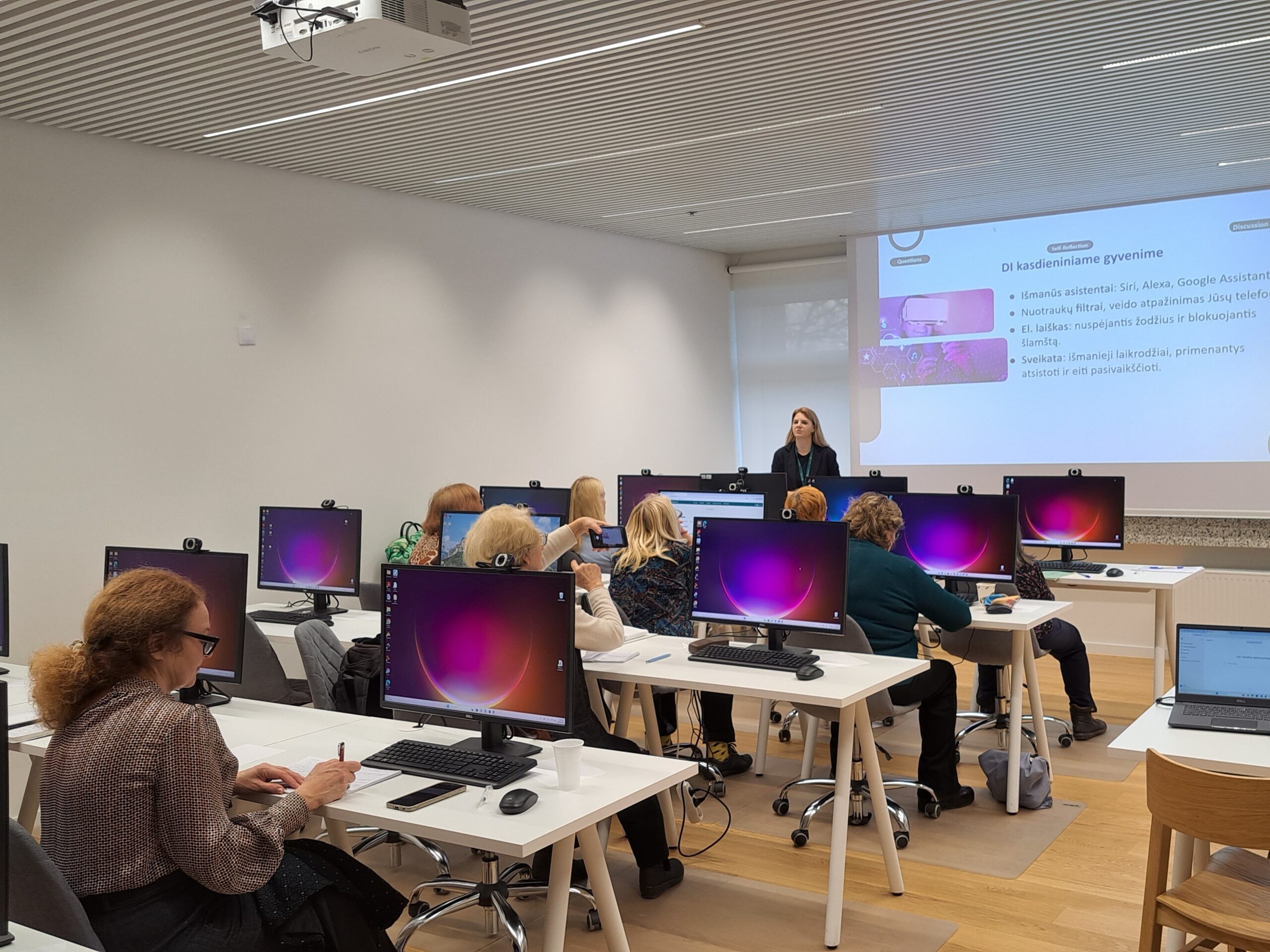 Ąžuolyno biblioteka kartu su partneriais iš Lietuvos, Estijos, Slovėnijos ir Italijos šiuo metu vykdo projektą, orientuotą į neformaliojo švietimo specialistų parengimą suaugusiuosius mokyti bazinių dirbtinio intelekto naudojimo įgūdžių. Rengiant metodinę medžiagą, nemažai dėmesio skirta etiškam DI naudojimui ir kritiniam mąstymui ugdyti.