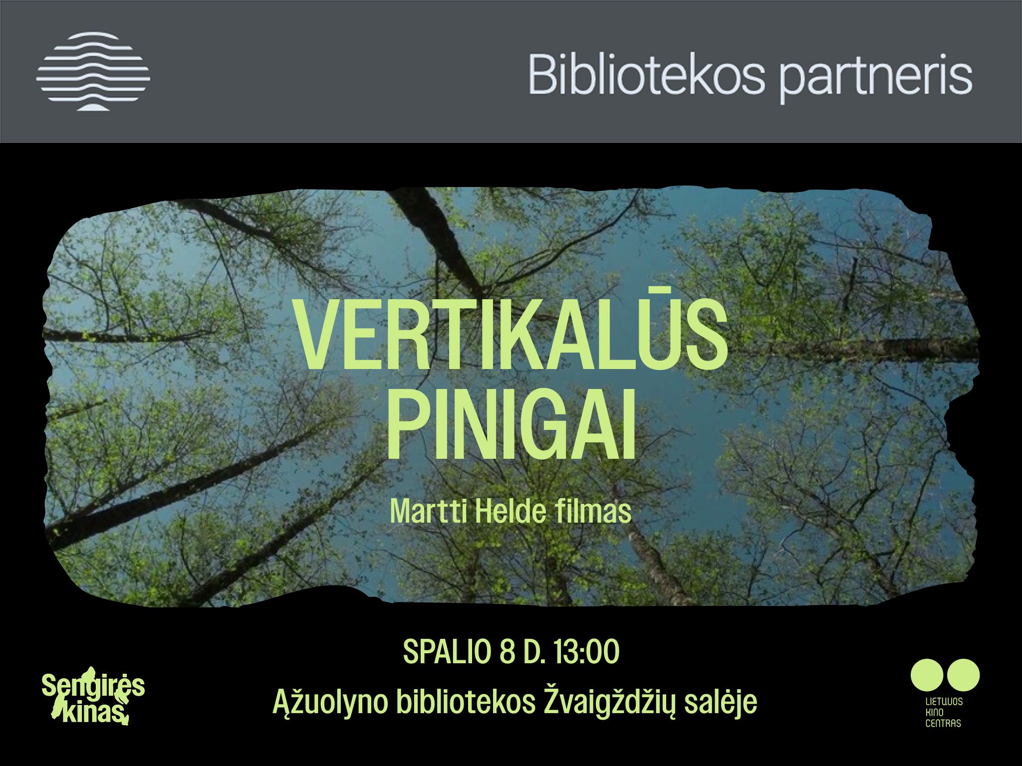 Kiną ir aplinkosaugą jungiantis projektas „Sengirės kinas“, kaip ir kiekvieną mėnesį, kviečia į filmo peržiūrą Ąžuolyno bibliotekoje. Spalio 8 d. 13.00 val. Žvaigždžių salėje (Radastų g. 2, 1 a.) bus rodomas dokumentinis filmas „Vertikalūs pinigai“ apie išsiskiriantį požiūrį į miškų ateitį Estijoje. Seansą lydės botaniko, biomedicinos mokslų daktaro Mindaugo Lapelės pristatymas.