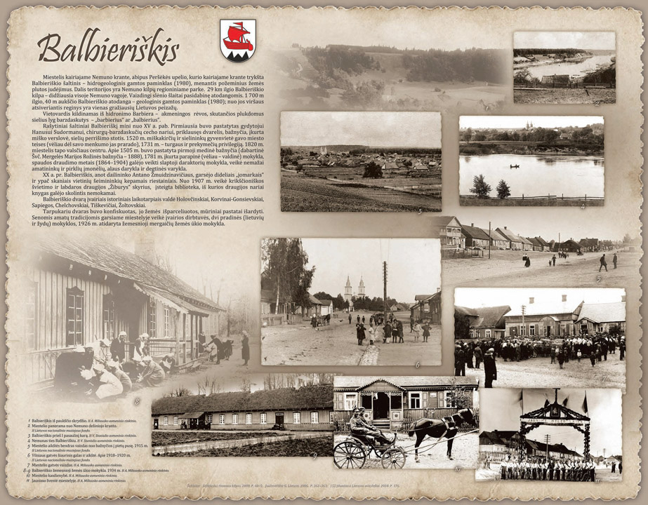 BALBIERIŠKIS Miestelis kairiajame Nemuno krante, abipus Peršėkės upelio, kurio kairiajame krante trykšta Balbieriškio šaltinis – hidrogeologinis gamtos paminklas (1980), menantis požeminius žemės plutos judėjimus. Dalis teritorijos yra Nemuno kilpų regioniniame parke. 29 km ilgio Balbieriškio kilpa – didžiausia visoje Nemuno vagoje. Vaizdingi slėnio šlaitai pasidabinę atodangomis. 1 700 m ilgio, 40 m aukščio Balbieriškio atodanga – geologinis gamtos paminklas (1980); nuo jos viršaus atsiveriantis reginys yra vienas gražiausių Lietuvos peizažų. Vietovardis kildinamas iš hidronimo Barbiera – akmeningos rėvos, skutančios plukdomus sielius lyg barzdaskutys – „barbierius“ ar „balbierius“. |