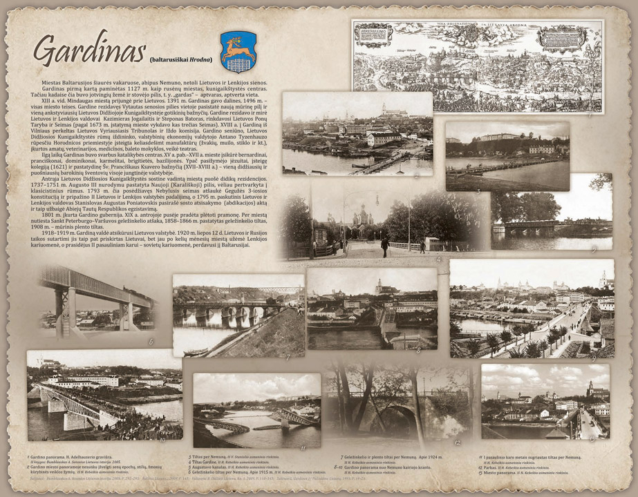 GARDINAS (baltarusiškai Hrodna) Miestas Baltarusijos šiaurės vakaruose, abipus Nemuno, netoli Lietuvos ir Lenkijos sienos. XIII a. vid. Mindaugas miestą prijungė prie Lietuvos. 1391 m. Gardinas gavo dalines, 1496 m. – visas miesto teises. Gardine rezidavęs Vytautas senosios pilies vietoje pasistatė naują mūrinę pilį ir vieną ankstyviausių Lietuvos Didžiojoje Kunigaikštystėje gotikinių bažnyčių. Gardine rezidavo ir mirė Lietuvos ir Lenkijos valdovai Kazimieras Jogailaitis ir Steponas Batoras, rinkdavosi Lietuvos Ponų Taryba ir Seimas (pagal 1673 m. įstatymą mieste vykdavo kas trečias Seimas). |