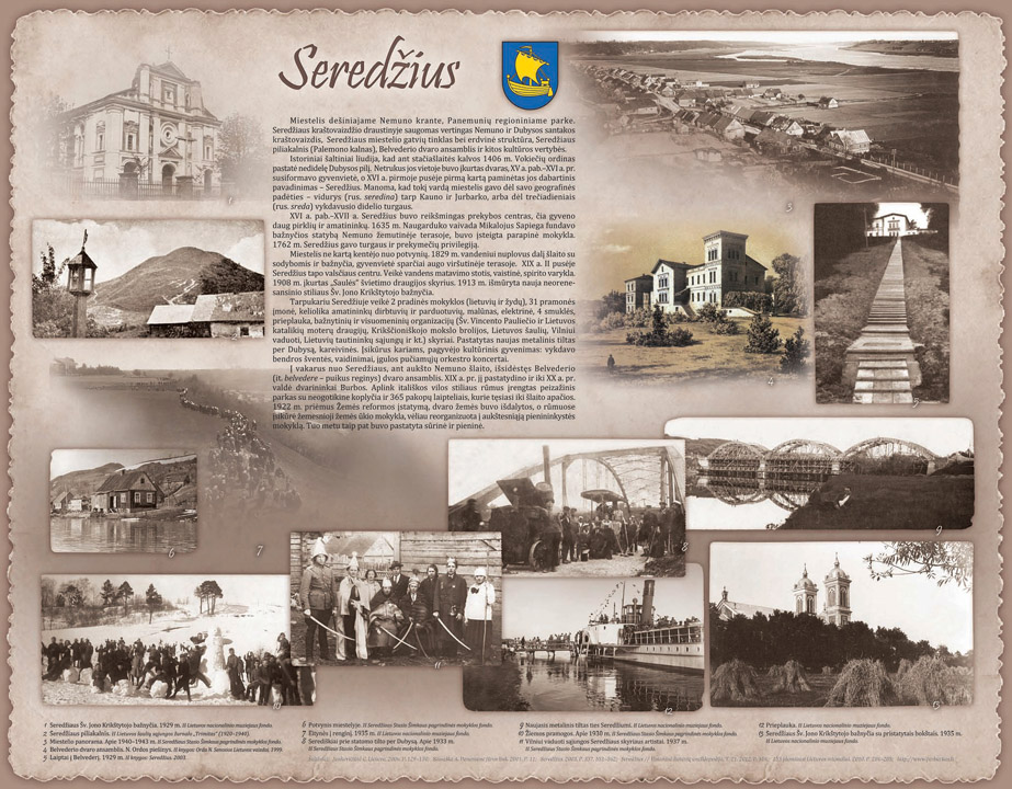 Tarpukariu Seredžiuje veikė 2 pradinės mokyklos (lietuvių ir žydų), 31 pramonės įmonė, keliolika amatininkų dirbtuvių ir parduotuvių, malūnas, elektrinė, 4 smuklės, prieplauka, bažnytinių ir visuomeninių organizacijų (Šv. Vincento Pauliečio ir Lietuvos katalikių moterų draugijų, Krikščioniškojo mokslo brolijos, Lietuvos šaulių, Vilniui vaduoti, Lietuvių tautininkų sąjungų ir kt.) skyriai. Pastatytas naujas metalinis tiltas per Dubysą, kareivinės. Įsikūrus kariams, pagyvėjo kultūrinis gyvenimas: vykdavo bendros šventės, vaidinimai, įgulos pučiamųjų orkestro koncertai. Į vakarus nuo Seredžiaus, ant aukšto Nemuno šlaito, išsidėstęs Belvederio (it. belvedere – puikus reginys) dvaro ansamblis. XIX a. pr. jį pastatydino ir iki XX a. pr. valdė dvarininkai Burbos. Aplink itališkos vilos stiliaus rūmus |